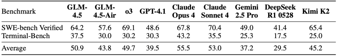 为了衡量 GLM-4.5 解决真实世界代码任务的能力,研究团队在两个具有挑战性的基准 SWE-bench Verified 和 Terminal-Bench 上进行了评测。