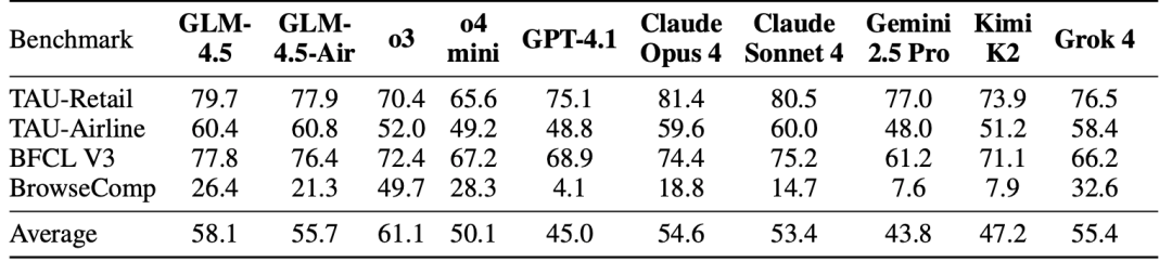 在 TAU-bench 上,GLM-4.5 的表现优于 Gemini 2.5 Pro,并且接近 Claude Sonnet 4;在 BFCL V3 上,GLM-4.5 在所有基线模型中取得了最高的总体得分;在 BrowseComp 上,OpenAI o3 的表现明显优于其他模型,而 GLM-4.5 的表现接近 o4-mini,并显著优于 Claude Opus 4。