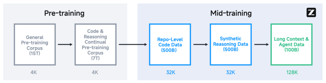 GLM-4.5 的预训练和中期训练,采用多阶段训练方案,并将序列长度从 4K 扩展至 128K。