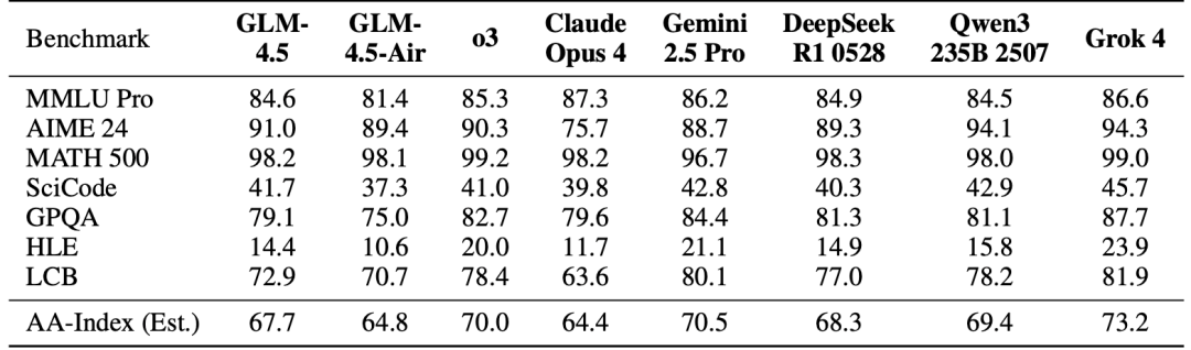 研究团队在七个基准上评估了 GLM-4.5 的推理能力,这些基准包括 MMLU-Pro、AIME 24、MATH 500、SciCode、GPQA、Humanity’s Last Exam(HLE)以及 LiveCodeBench(LCB)。
