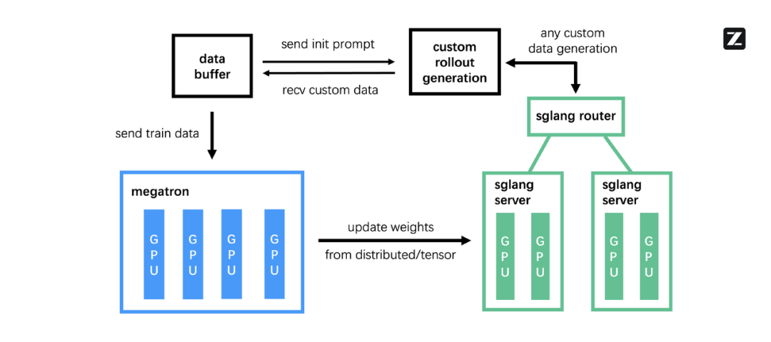 训练(Megatron),处理主要的训练过程,从 Data Buffer 读取数据,并在训练结束后将参数同步到 rollout 模块;