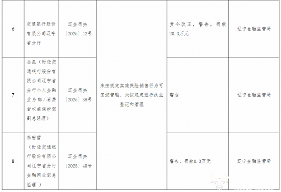 据金融监管局官网显示,交行辽宁省分行此次被罚涉及“未按规定实施保险销售行为可回溯管理、未按规定进行执业登记和管理”两项问题,被警告并罚款20.3万元。此外,因上述问题,该省分行个人金融业务部/消费者权益保护部副总经理吕昆、金融同业部总经理杨宏哲均被警告,杨宏哲还被罚款0.3万元。