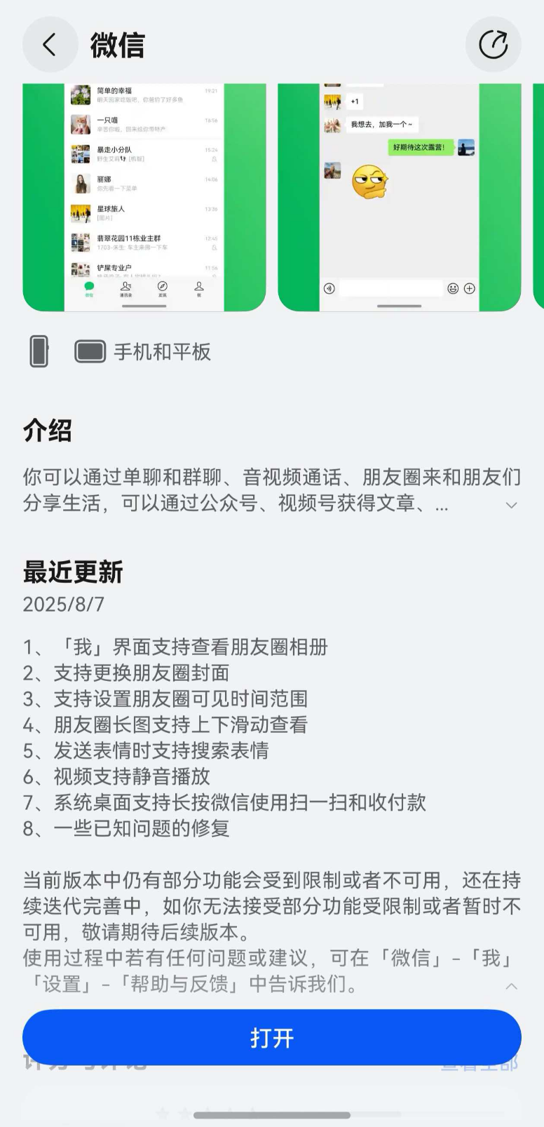 目前该版本也已上架平板端应用市场。鸿蒙版微信正以更快的迭代速度,将用户需求变为现实,使用体验渐趋完善,也因此收获了越来越多用户的喜欢和好评。目前鸿蒙版微信安装量已突破1100万,快去应用市场更新,享受更智能、更便捷的社交体验吧!