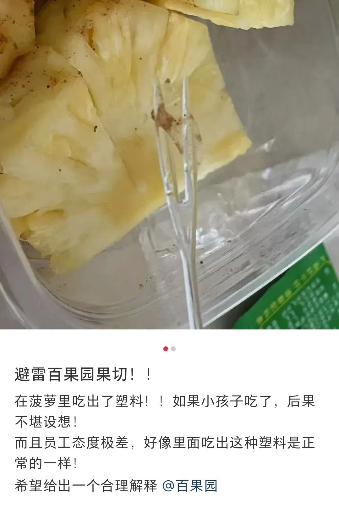 还有人在百果园的果切菠萝里吃出了塑料碎片;