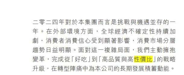 比如那句“我们零售事业群聚焦高质量发展,着力提升门店运营效能及重塑「高性价比」用户心智”,还有“我们主动拥抱变革,完成从‘好吃’到‘高品质与高性价比’的战略升级”,字里行间都是对市场的妥协。