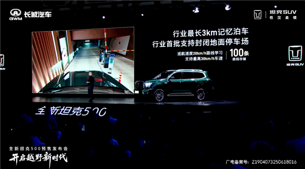 同时,全新坦克500做到了行业最长的三公里记忆泊车,也是行业首批支持封闭地面的停车场、室外停车场以及跨楼层停车场的泊车功能。即便固定车位被占,也会选择一个附近车位进行安全泊入。