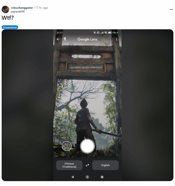 日前,Reddit玩家“papanak94”在用人工智能应用Google Lens翻译《明末:渊虚之羽》里的牌匾时,出现了非常搞笑的一幕——竟然将“明心见性”翻译成了“人类的繁衍行为使人们相互理解”,引来一些玩家围观。