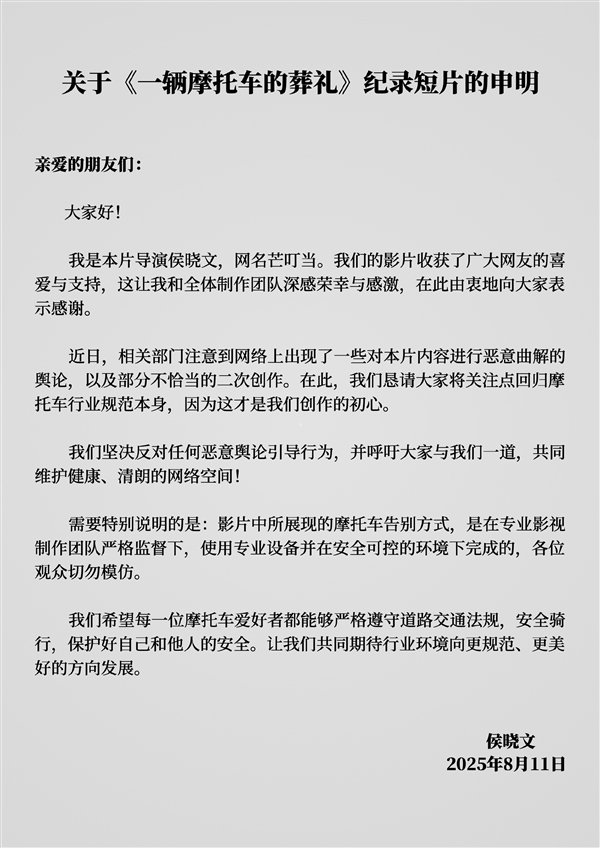同时他还做了特别说明:影片中所展现的摩托车告别方式,是在专业影视制作团队严格监督下,使用专业设备并在安全可控的环境下完成的,各位观众切勿模仿。