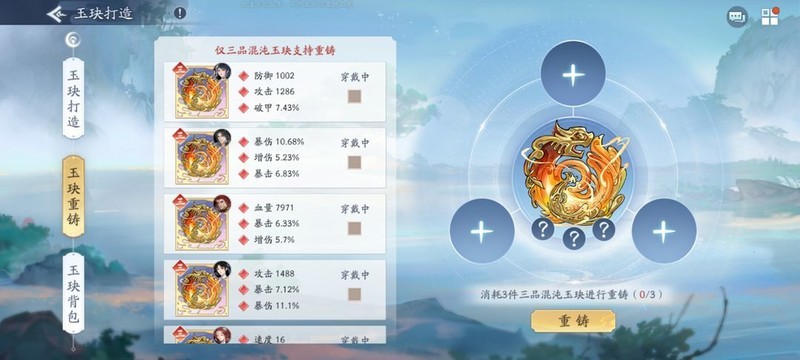 玉玦重铸是将三个无用的三品玉玦合成一个,属性随机,不建议轻易尝试。