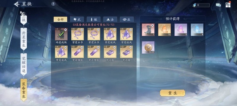 多余装备可重生返还资源,除红装外,每次重生需消耗一颗洗练石。