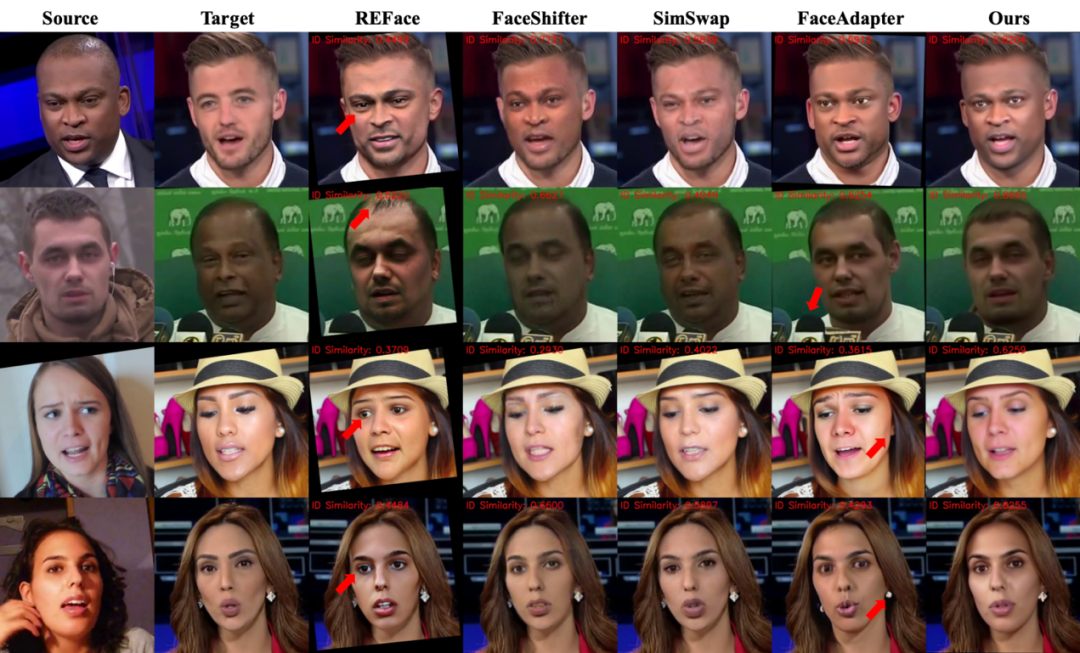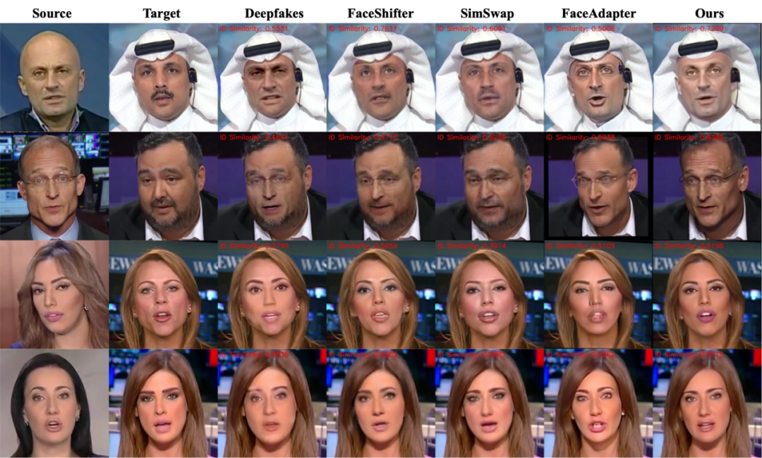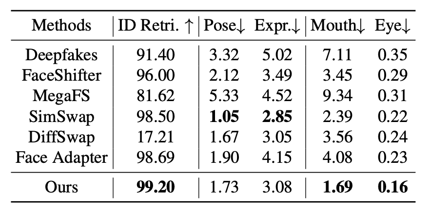为全面评估 DynamicFace 的性能,研究团队在 FaceForensics++(FF++)和 FFHQ 数据集上进行系统性的定量实验,并与当前最具代表性的 6 种换脸方法进行对比,包括 Deepfakes、FaceShifter、MegaFS、SimSwap、DiffSwap 以及 Face Adapter。