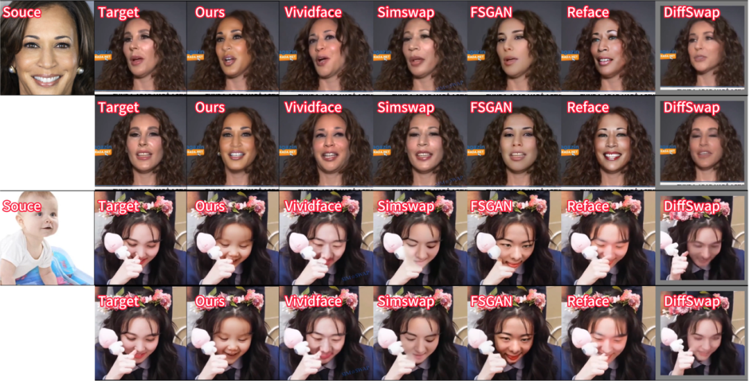 与传统人脸置换方法相比,DynamicFace 独创性地将扩散模型(Diffusion Model)与可组合的 3D 人脸先验进行深度融合,针对人脸运动与身份信息进行了精细化解耦,以生成更一致的人脸图像和视频。