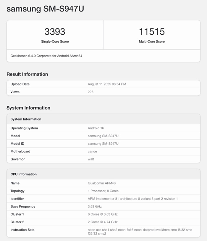 此次现身的测试机型疑似为三星 Galaxy S26 系列,型号代号为 SM-S947U,运行 Android 16 系统。代号为 SM-S947U 的设备运行 Android 16,单核成绩达到 3393,多核成绩则高达 11515。结合机型编号与系统版本,这很可能是搭载骁龙 8E2 的 Galaxy S26 Ultra 美版工程机,测试使用的是 Geekbench 6.4.0 Corporate 版本。其 CPU 架构为 8 核设计,包括 2 颗主频高达 4.74 GHz 的大核,以及 6 颗 3.63 GHz 的性能核心,频率配置明显比现款量产机更激进。