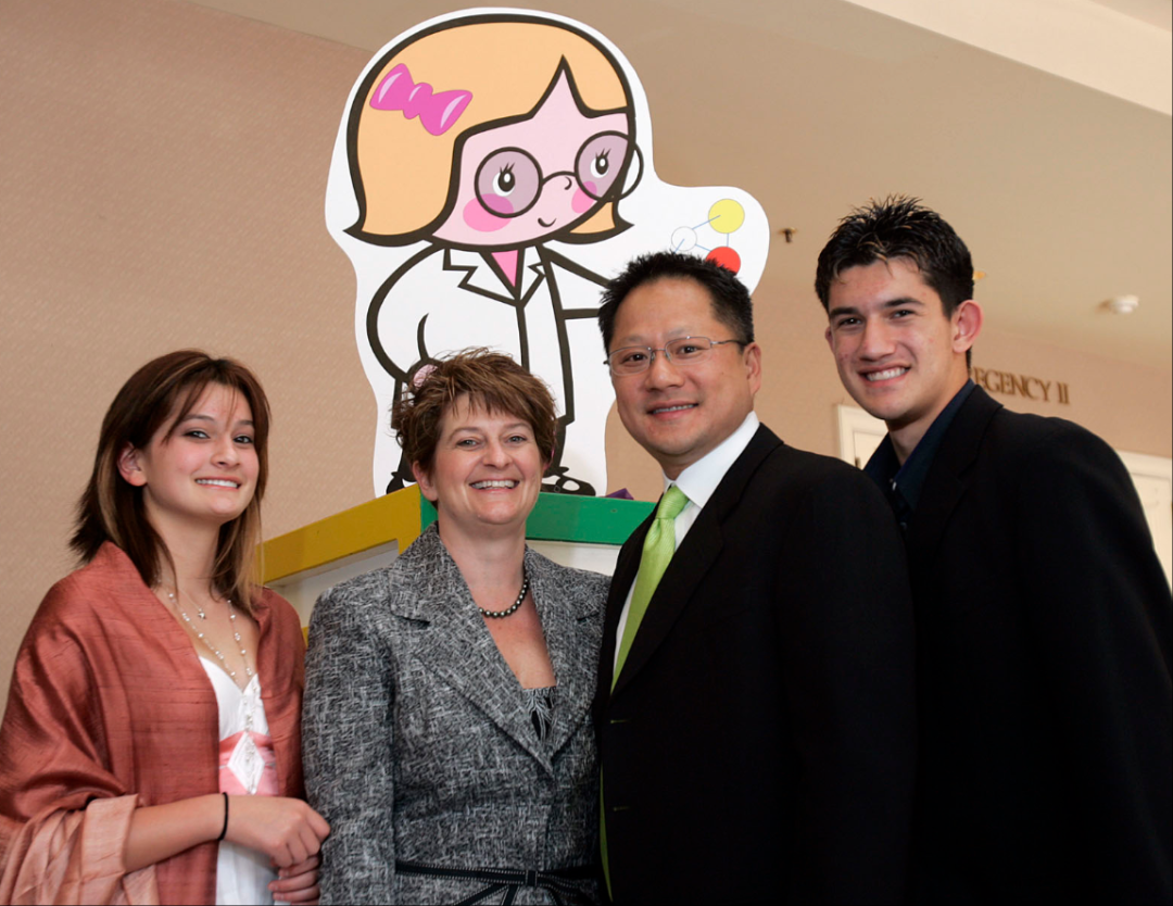 2007年的黄氏家族(从左到右):黄仁勋女儿麦迪逊、黄仁勋妻子洛丽、黄仁勋和黄仁勋女儿子斯宾塞