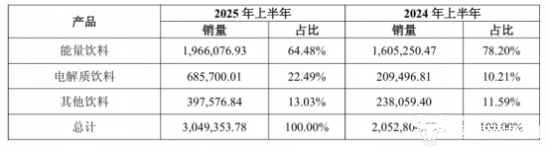 值得一提的是,东鹏饮料公告显示,东鹏饮料积极进行多品类布局,培育第二增长曲线产品,2025年半年度,东鹏饮料能量饮料销量占比由2024年的78.20%下降为64.48%,电解质饮料销量占比由10.21%上升为22.49%,呈现出“多点开花”的态势。