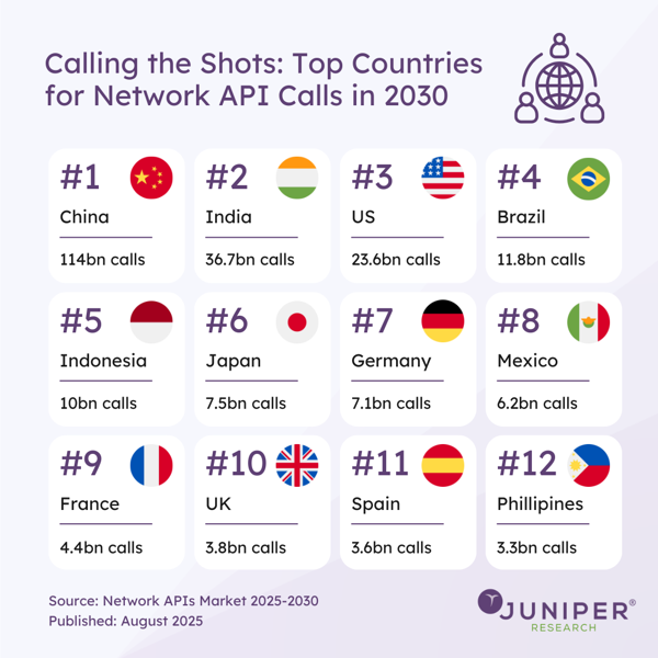 Juniper Research的研究报告预测,到2030年,中国将成为全球市场电信网络API调用次数最高的国家,印度和美国则分别位列第二、三位。