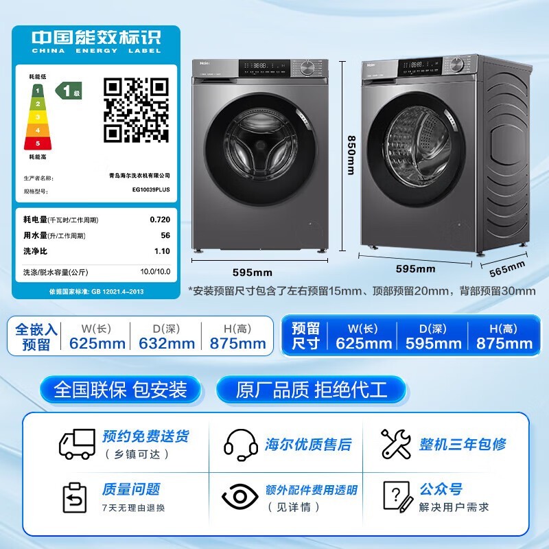 海尔滚筒洗衣机EG10039PLUS超薄10公斤智能投放