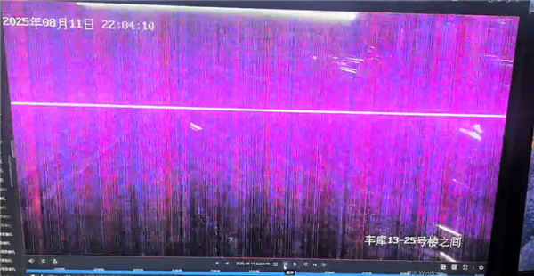 等到车辆非常靠近摄像头时,伴随着滴滴的警报声,摄像头顿时被烧坏,拍摄的画面出现了密密麻麻的线条和坏点。
