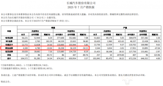 7月份,欧拉品牌的销量为4300辆,同比下降10.04%。