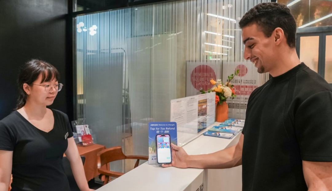 来自免签国沙特阿拉伯的 Ziyad 体验了退税新服务。他在成都春熙路百盛购物中心购买熊猫特色纪念品后,带着商家开具的退税单来到 IFS退税服务点,签订协议书并办理信用卡预授权后,用“支付宝碰一下”轻轻一碰退税台卡,显示退税码,由退税工作人员扫码核实,税款即刻打入 Ziyad 的支付宝。