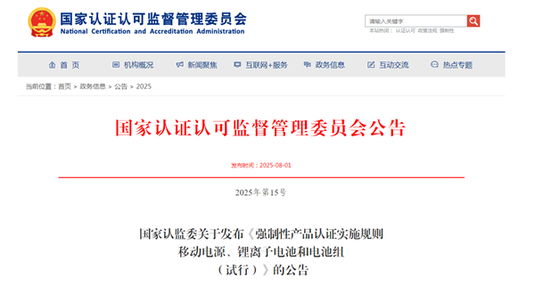 快科技8月13日消息,为强化移动电源、锂离子电池和电池组强制性产品认证管理,国家认监委制定了《强制性产品认证实施规则移动电源、锂离子电池和电池组(试行)》。