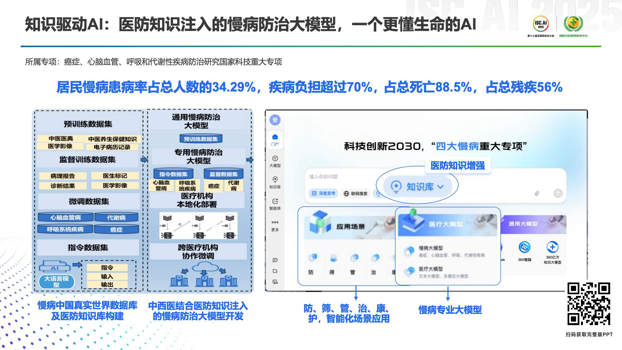 彭际华认为,通用大模型就像刚毕业的优等生——博闻强记却缺乏行业历练;对企业而言,垂直专精的智能体更具生命力。他以医疗健康为例,顶尖医疗机构通过360AI企业知识库汇聚典籍、影像、病历等真实数据,打造出懂中国体质的“慢病防治大模型”,覆盖“防、筛、治、管、康”全周期智能体应用场景。