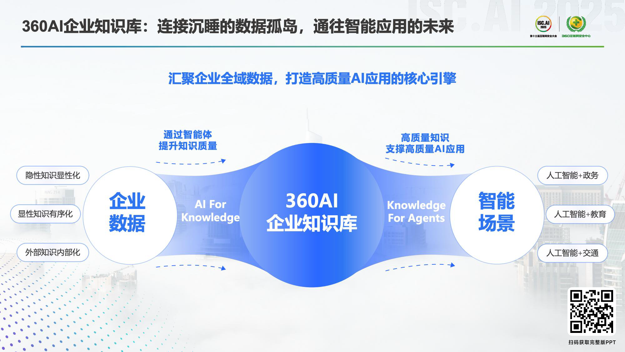 360亿方智能作为360数智集团全资子公司,携旗下核心AI产品360AI企业知识库亮相2025 ISC.AI活动现场,现场人潮涌动,反响热烈,与会领导、专家及众多嘉宾就360AI企业知识库产品功能及落地价值进行深入了解,产品能力及应用效果获得高度肯定。同时,360数智化集团总经理彭际华在《企业级AI应用领航者》主题论坛重磅发布360AI企业知识库并分享其核心能力与落地实践。