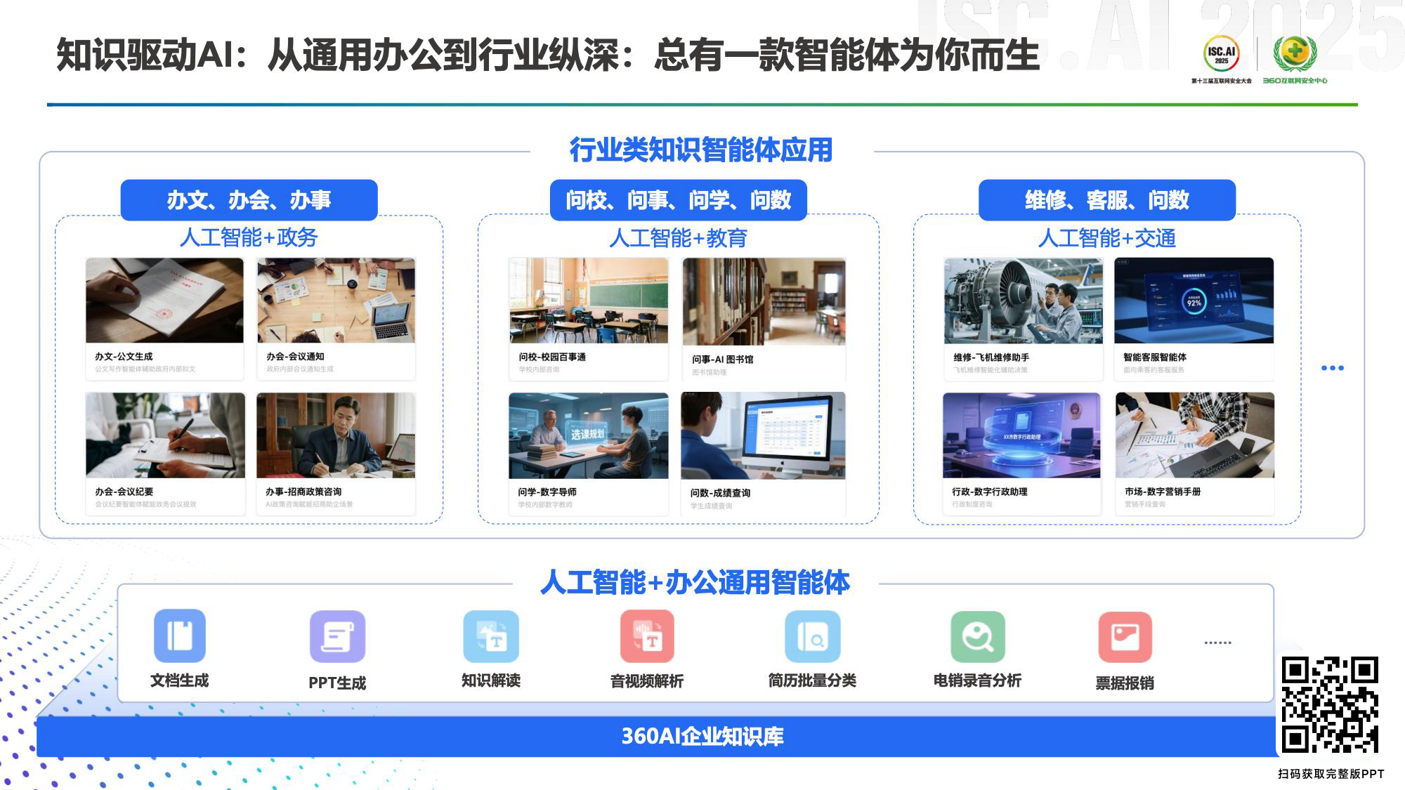 “无论你身处哪个行业,哪个岗位,总有一款智能体,是为你而生”。回归企业AI应用落地,360AI企业知识库在横向的通用办公层面为企业提供了覆盖文档写作、PPT生成、知识深度思考、会议记录解析等全场景办公通用智能体;在纵向行业应用层面,产品“上岗”政务、教育、交通等关键核心领域,深入解决行业内核心业务痛点。目前,360AI企业知识库已服务政府、高校、交通、能源、制造、医疗、贸易等20多个行业的标杆客户并深度推动智能体落地AI应用。(产品体验:https://aiplus.360.cn/?=scsm)