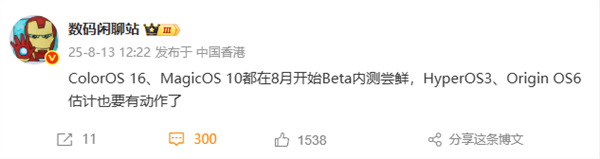 今日,数码博主“数码闲聊站”表示,ColorOS 16、MagicOS 10都在8月开始Beta内测尝鲜,澎湃OS 3、OriginOS 6估计也要有动作了。