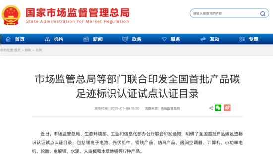 党的二十届三中全会《决定》强调“构建碳排放统计核算体系、产品碳标识认证制度、产品碳足迹管理体系”。市场监管总局等四部门联合印发的《关于公布产品碳足迹标识认证试点名单的通知》《产品碳足迹标识认证试点认证目录(第一批)》明确遴选广东省佛山市开展空调产品碳足迹标识认证试点工作,并将房间空调器等17种产品纳入全国首批认证试点目录范围。