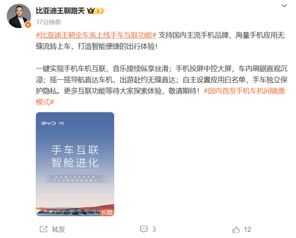 快科技8月13日消息,比亚迪王朝网销售总经理路天今日宣布,比亚迪王朝全车系上线手车互联功能,支持国内所有主流手机品牌,海量手机应用无缝流转上车。