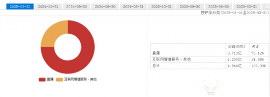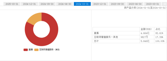 欢聚集团的主营构成包括直播业务和其他增值服务。其中直播业务占比较大。2025年第一季度,直播业务占主营收入的75.12%,收入为3.713亿元,较去年下降了7.4%。,直播业务的萎缩导致欢聚集团2025年一度相较于去年同时期减少将近一亿收入。