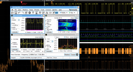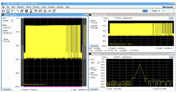 实时频谱分析仪(RTSA)擅长高动态范围捕获频域中的瞬态与间歇信号,对调试杂散发射或干扰尤为关键。结合时域可视化与解调分析能力后,RTSA 在跨域测试中表现出色。Tektronix 所有 RTSA 均搭载 SignalVu 软件套件,可同时显示频谱、频谱图、时间概览、幅度、相位等关联视图。