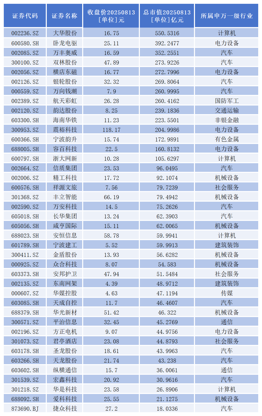 截至8月13日收盘,40家浙江上市公司中,总市值超过百亿的一共有14家,分别是大华股份、卧龙电驱、万丰奥威、双林股份、横店东磁、银轮股份、万向钱潮、航天彩虹、韵达股份、海南华铁、震裕科技、宁波韵升、容百科技、浙大网新。