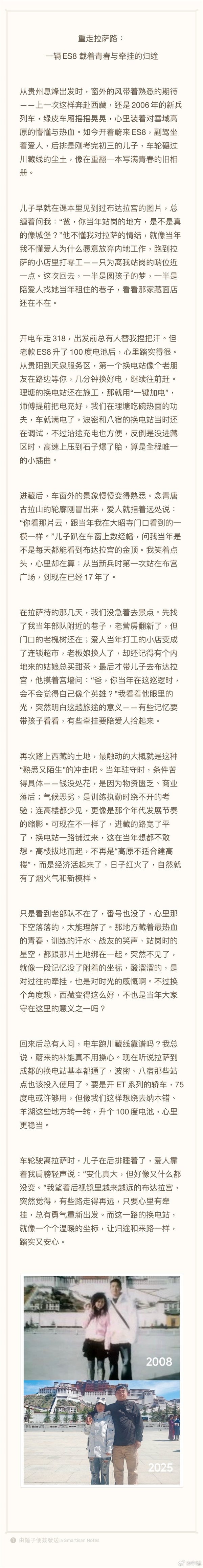 快科技8月13日消息,蔚来汽车创始人、董事长、CEO李斌今日分享了一条“援藏老兵夏小宝时隔19年重走G318回到拉萨”的故事。