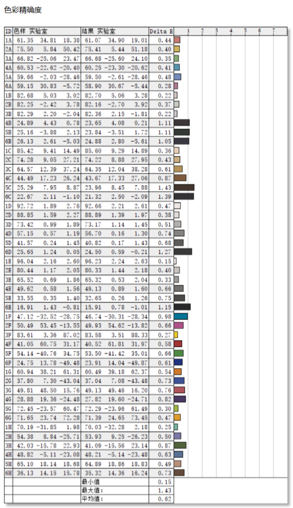 在色彩准确度的测试中,HKC T2755U显示器结果为平均ΔE值为0.62,最大ΔE为1.43。一般来说平均ΔE<2,人眼就基本上分辨不出色彩的差异,HKC T2755U显示器的平均色准低于1,最大值也不超过2,完全能够满足专业工作的需求。