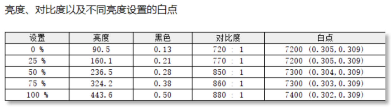 色温一致性方面,这款显示器的白点色温稳定在7200K-7400K之间,色温随亮度的升高变大,屏幕最大亮度为443.6尼特。