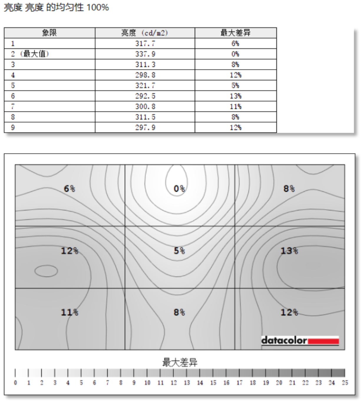 亮度均匀性的测试中,HKC T2755U显示器整体表现也不错,亮度最大为第2象限,最大差异在第6象限,差值为45.4cd/m²。