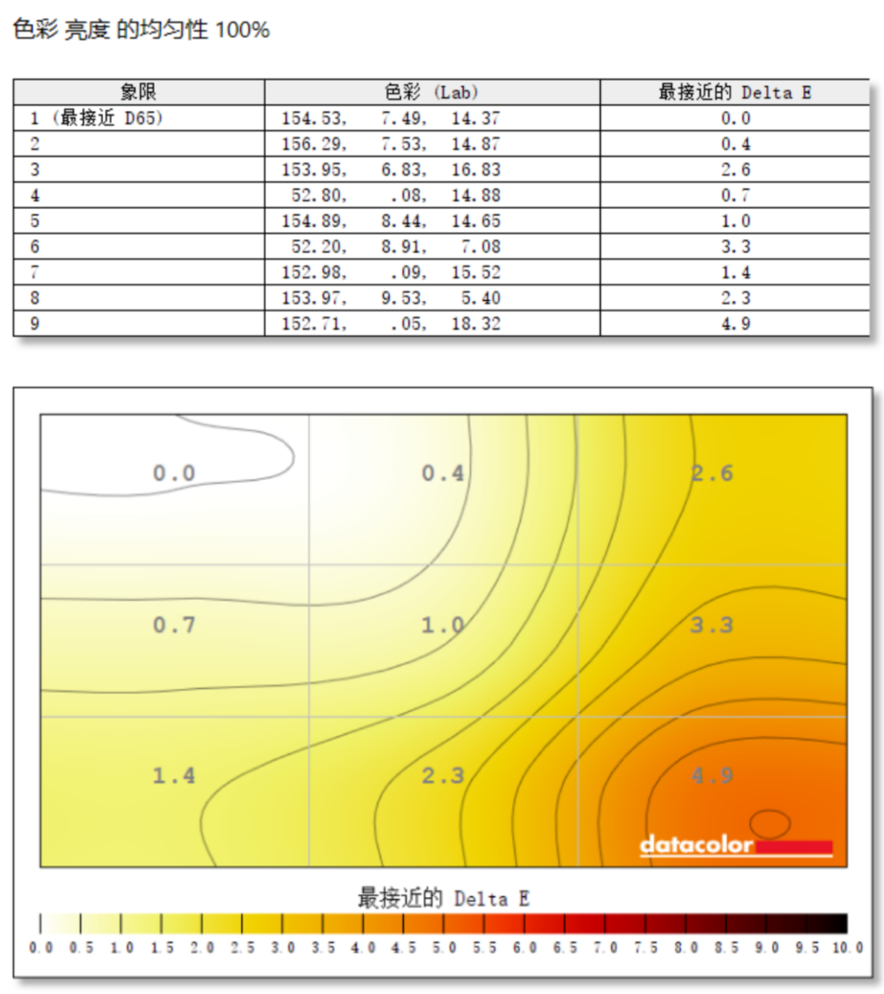 在色彩均匀性的测试中,HKC T2755U显示器的第1象限最接近D65的标准,显示器右边第9象限与标准色温差值最大,不过也只有4.9,整体色彩均匀度表现非常不错。