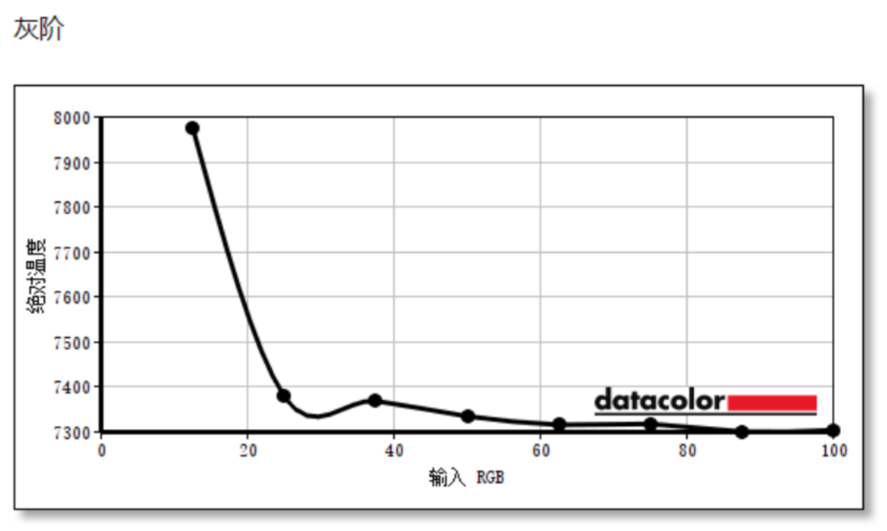 灰阶方面,显示器在30-100亮度下表现稳定,整体色温维持在7300K-7400K之间,色温略微偏冷。