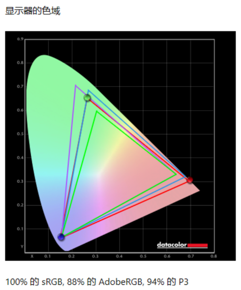 首先是色域测试,根据SpyderXElite软件的测试结果显示,HKC T2755U显示器sRGB色域的覆盖度为100%,AdobeRGB色域的覆盖度为88%,P3色域的覆盖度为94%,这个表现基本达到了官方宣传水平。