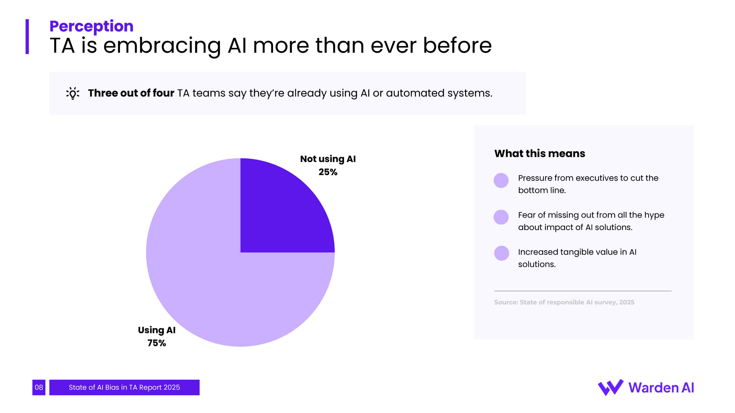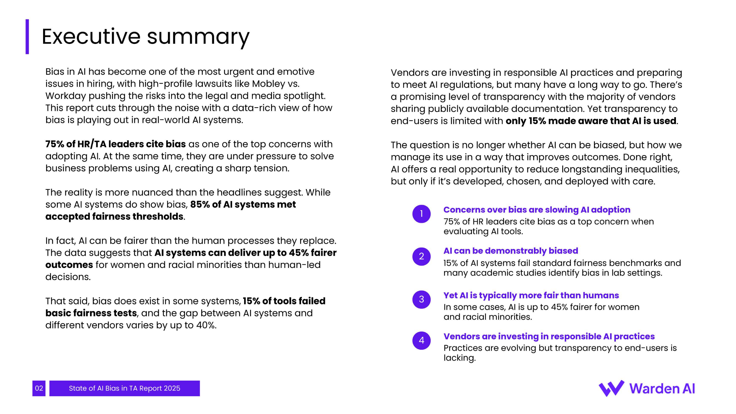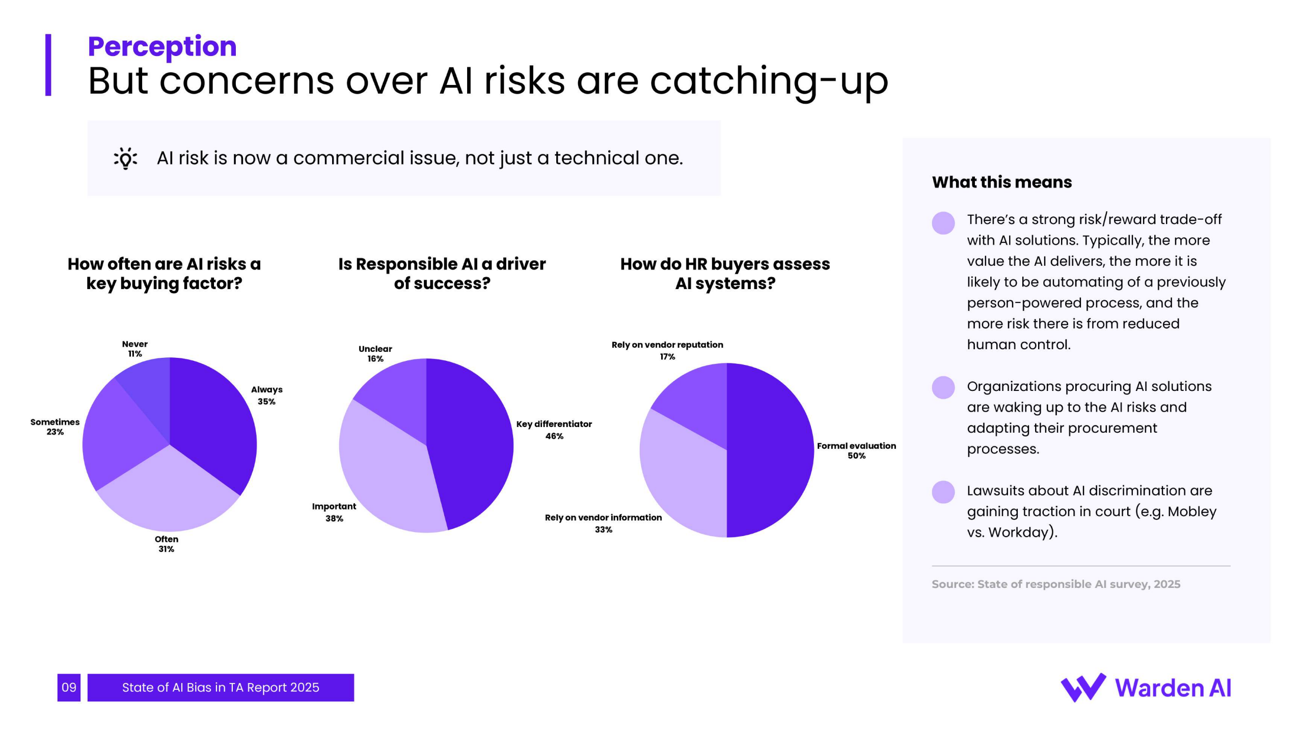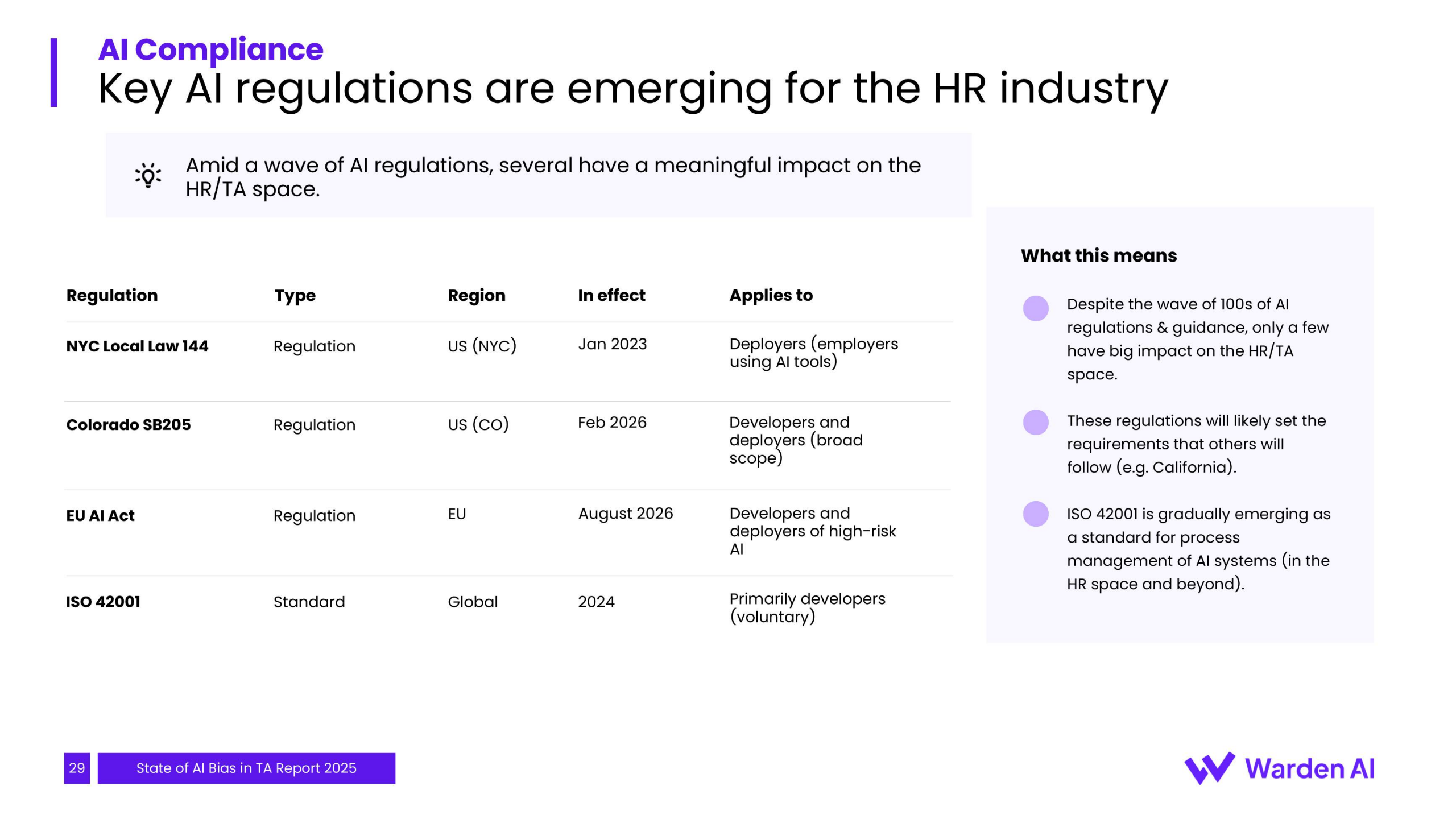 未来趋势表明,随着纽约市、欧盟等地的AI监管法规相继生效,企业面临的合规压力将急剧增加。目前仅有约42%的供应商为纽约市法规做好了准备,市场合规成熟度参差不齐。这预示着招聘AI的关注点正从“是否存在偏见”转向“如何进行治理与验证”。企业的采购决策将日益依赖于供应商提供的第三方审计报告与持续监控能力,偏见风险的责任正从技术供应商单方转向企业与供应商的共担模式。