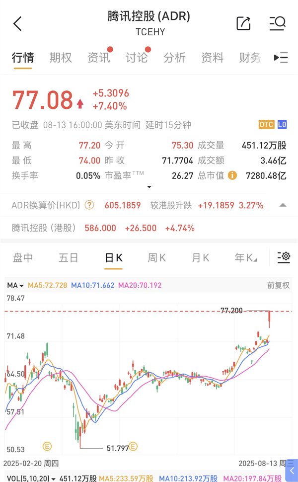 PS.腾讯控股ADR,即腾讯控股的美国存托凭证,它是由美国的存托银行发行,美国投资者通过购买ADR,无需直接开通港股账户,就能在美股市场(如纳斯达克或纽交所)交易腾讯股票,享受与持有港股相应的分红、投票等权益。