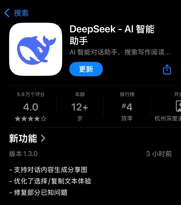 根据手机应用商店显示,DeepSeek App今天发布了1.3.0版本更新,支持对话内容生成分享图功能。