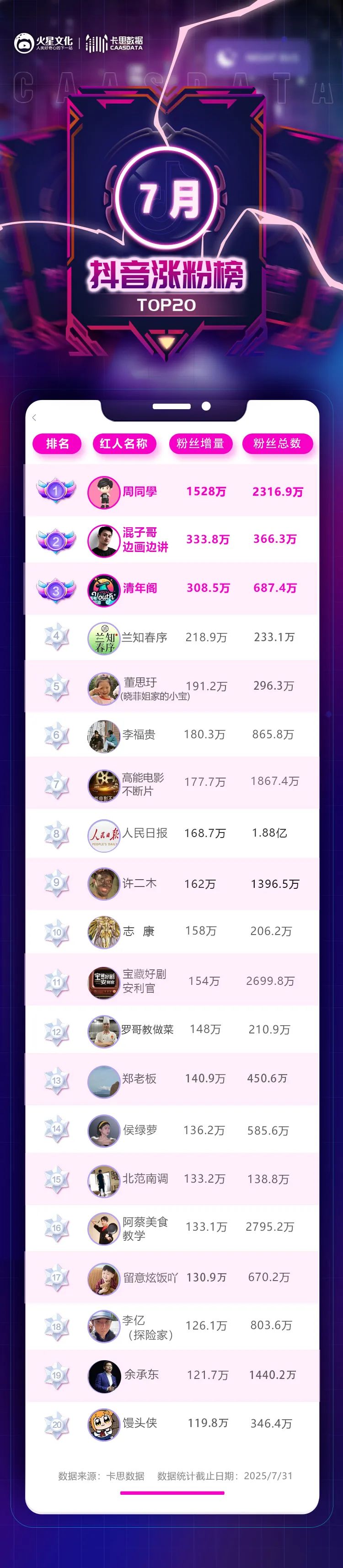 抖音7月涨粉榜已出,我们一起来看: