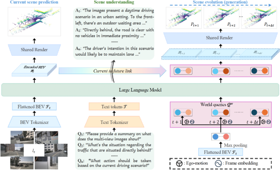 2. 知识传递:经过 LLM 处理后,这些富含知识的世界查询被一个 “当前 - 未来” 连接模块(Current to Future Link)所使用。该模块通过交叉注意力将世界查询中蕴含的 “理解” 成果,有效地注入到对未来场景的预测中,引导模型生成未来多帧的 BEV 特征。