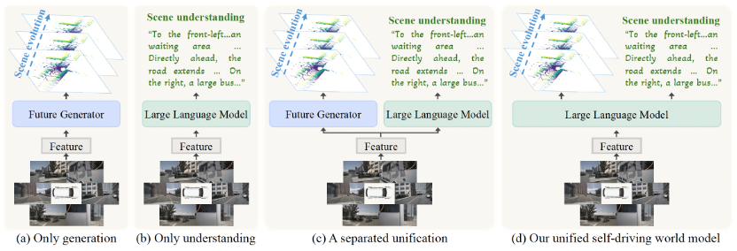 世界模型(Driving World Model, DWM)侧重于未来场景的生成与预测,但缺乏对当前环境的细致语义理解,难以回答 “现在是什么情况?”、“驾驶员该如何决策?” 等问题。