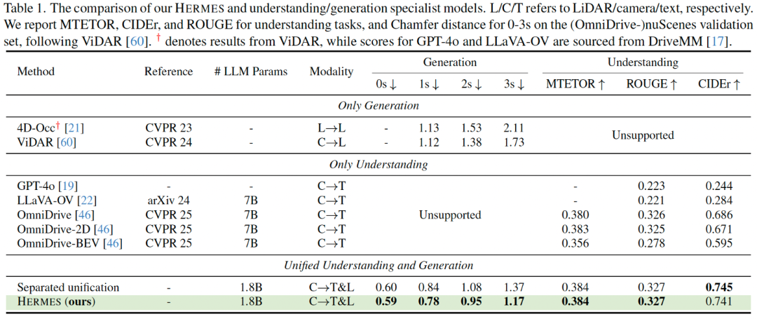 在场景描述、视觉问答等理解任务上,HERMES 在 CIDEr、METEOR、ROUGE 等主流自然语言生成指标上超越了 OmniDrive 等理解专用模型,CIDEr 提升 8%。