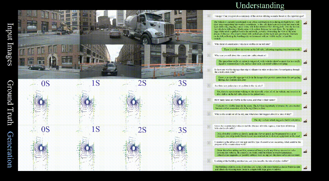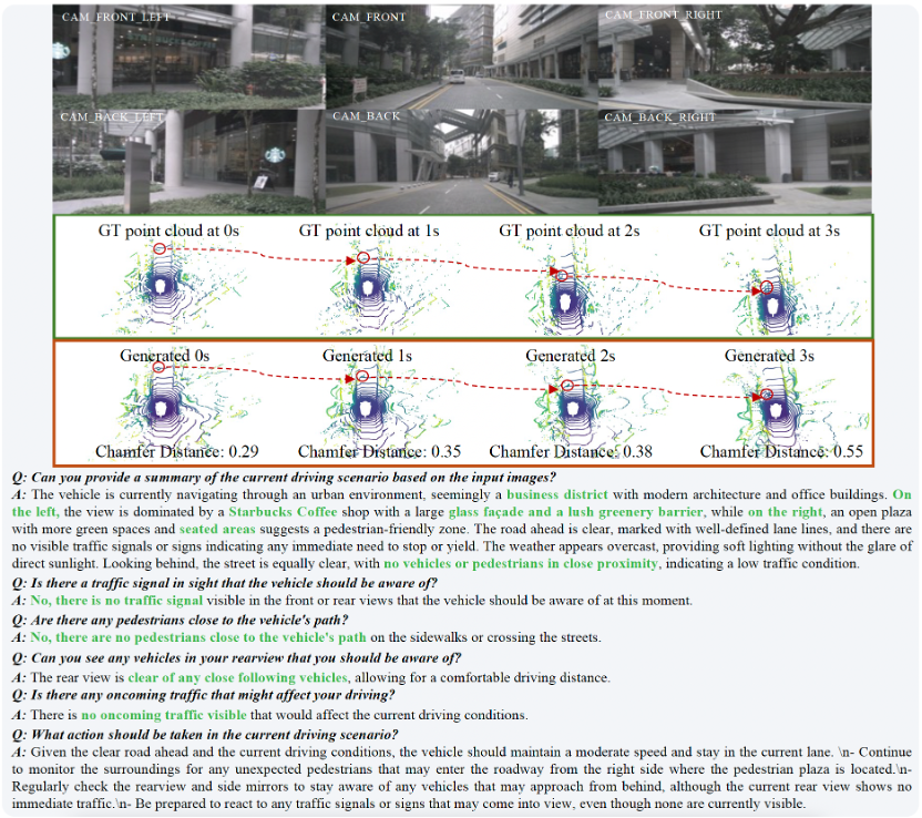 HERMES 不仅能够生成时序连贯且几何精确的未来点云,还能对驾驶场景的细节进行精准描述。无论是预测动态物体的移动,还是识别路边的商家,HERMES 都展现出强大的综合能力。更多可视化结果请访问项目主页。