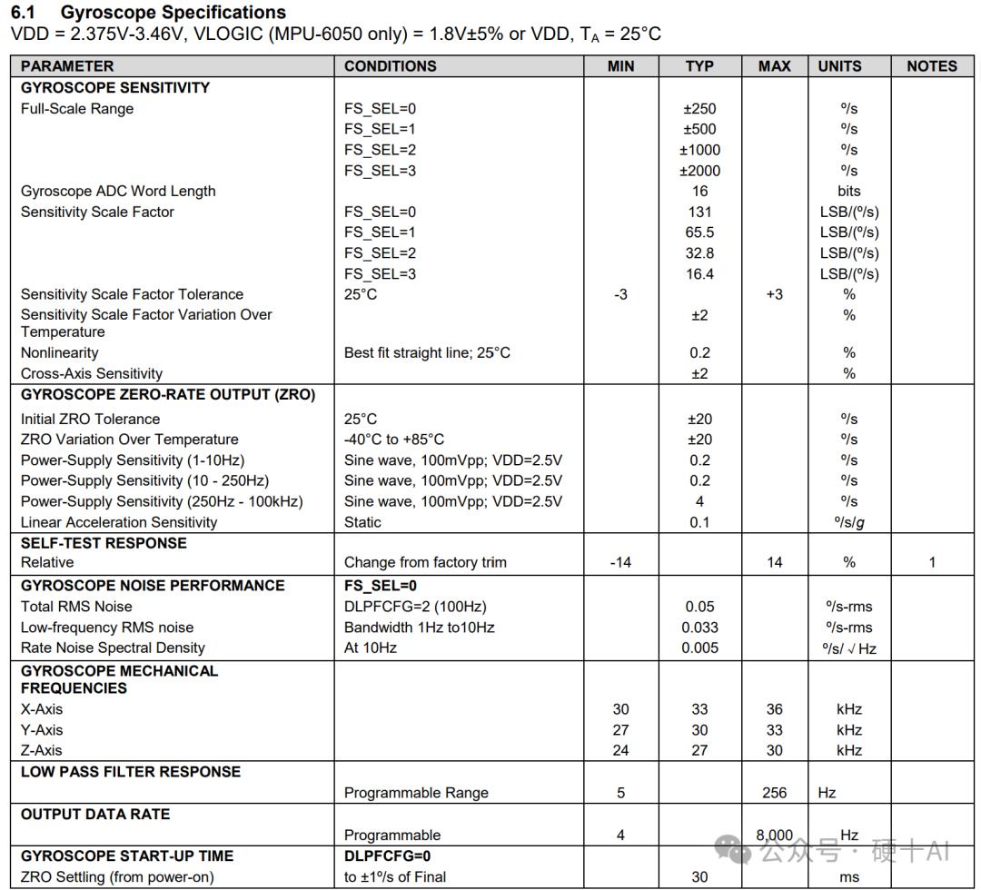 IMU的参数可以在芯片手册里获得,这里列举一些常用的参数,这些参数说明了IMU的性能范围,可以为选型提供参考。